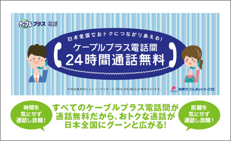 全国どこでも、ケーブルプラス電話間の通話であれば、通話料が無料になります。例えば、平塚←→大阪、平塚←→沖縄など、いろんな地域間で無料通話が広がります。