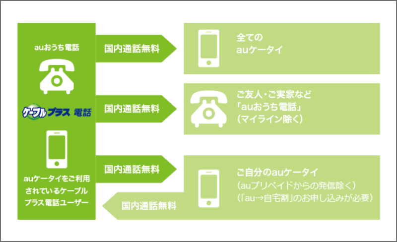 「auスマートフォン」「auケータイ」と「auおうち電話」(ケーブルプラス電話)をセットでご利用いただくと、auスマートフォン・auケータイへの国内通話が日本全国無料!