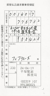 あしなが育英会へ以下の通り送金致しましたのでご報告致します。