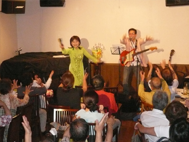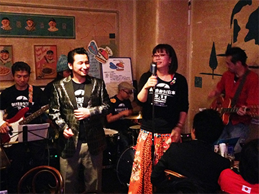 「助け合おう!日本」ライブを開催。出演者もお客様もみな助け合おうTシャツを着用。
