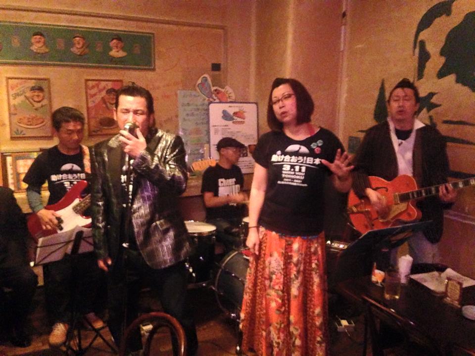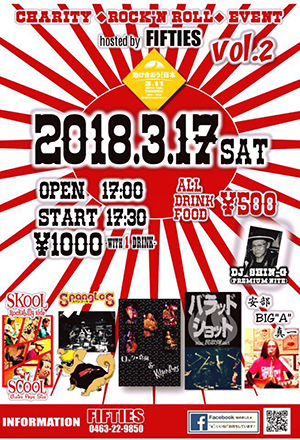 2011年11月12日(土)「fifties ロックンロールパーティ」にて「助け合おう!日本」のステッカーとパンフレットの配布活動及びチャリティTシャツの販売、出演者はTシャツを着用しPRを行いました。
