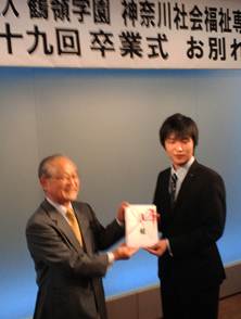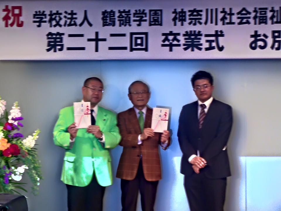 神奈川福祉専門学校の学園祭「鶴嶺祭」で2011年11月12日に行っていただいた、学生の皆様により「助け合おう!日本」の募金活動による寄付金を、卒業式「お別れ会」にて